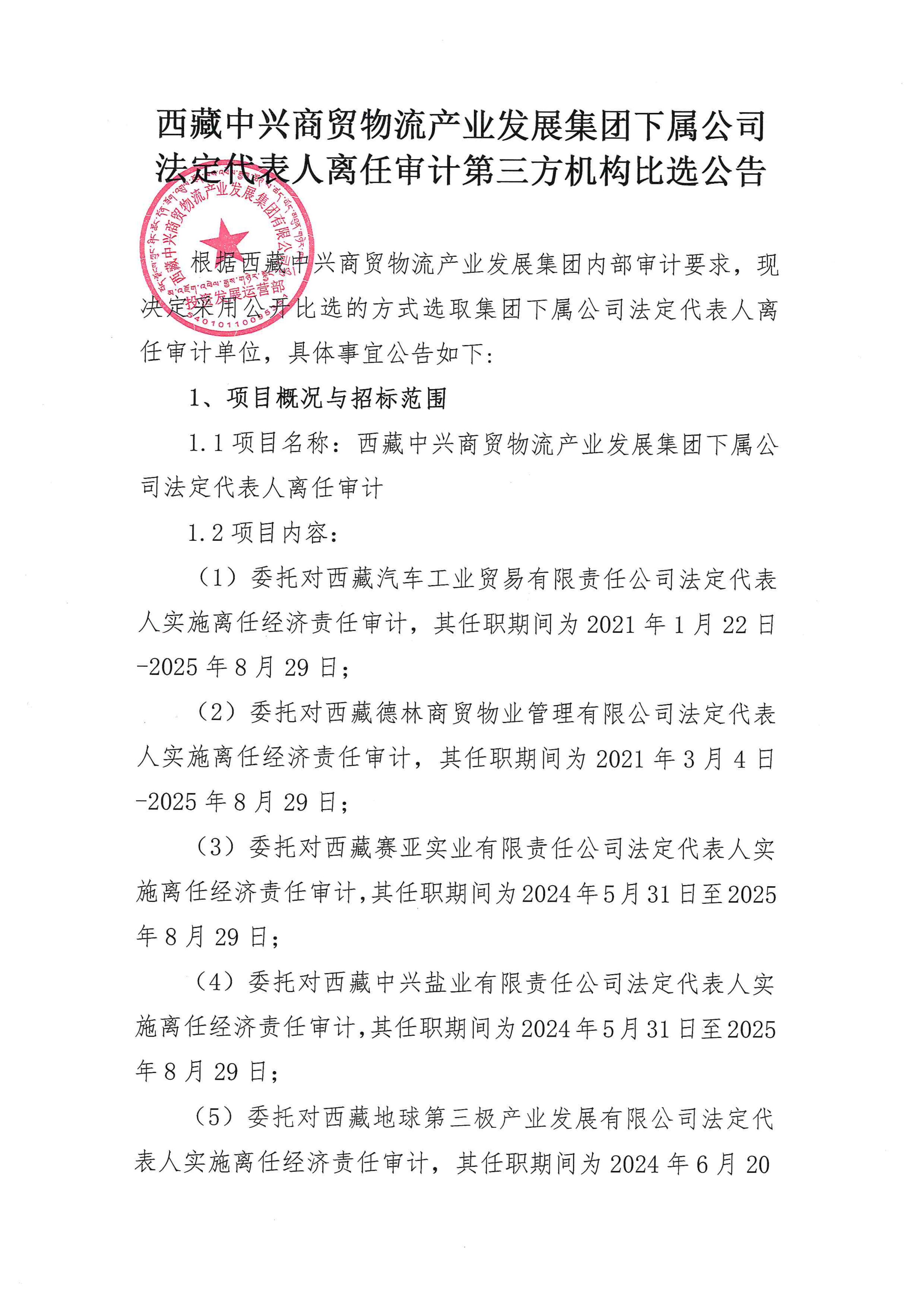 西藏中興商貿物流產(chǎn)業(yè)發(fā)展集團下屬公司法定代表人離任審計第三方機構比選公告