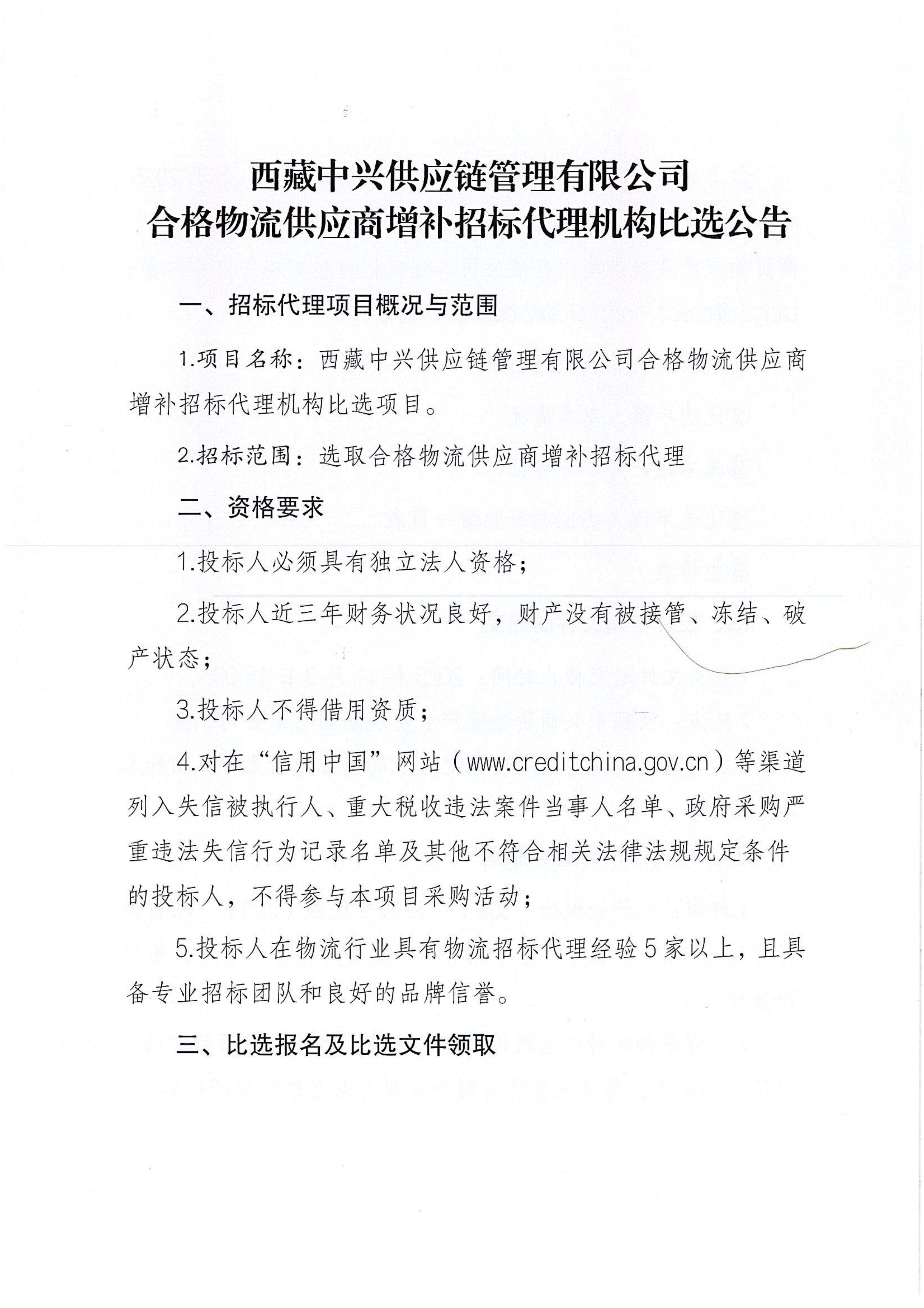 西藏中興供應(yīng)鏈管理有限公司合格物流供應(yīng)商增補(bǔ)招標(biāo)代理機(jī)構(gòu)比選公告