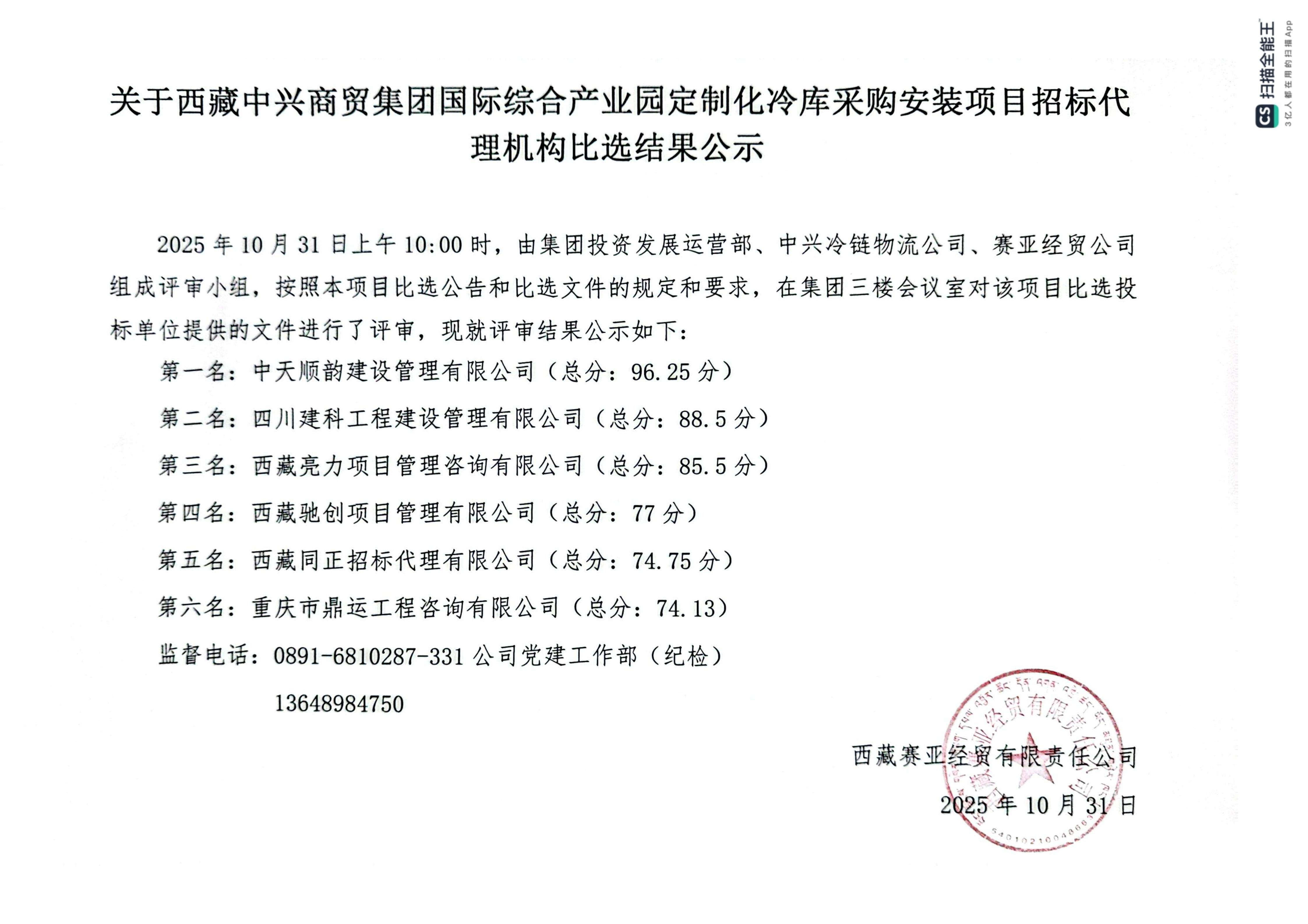 關(guān)于西藏中興商貿(mào)集團(tuán)國(guó)際綜合產(chǎn)業(yè)園定制化冷庫(kù)采購(gòu)安裝項(xiàng)目招標(biāo)代理機(jī)構(gòu)比選結(jié)果公示